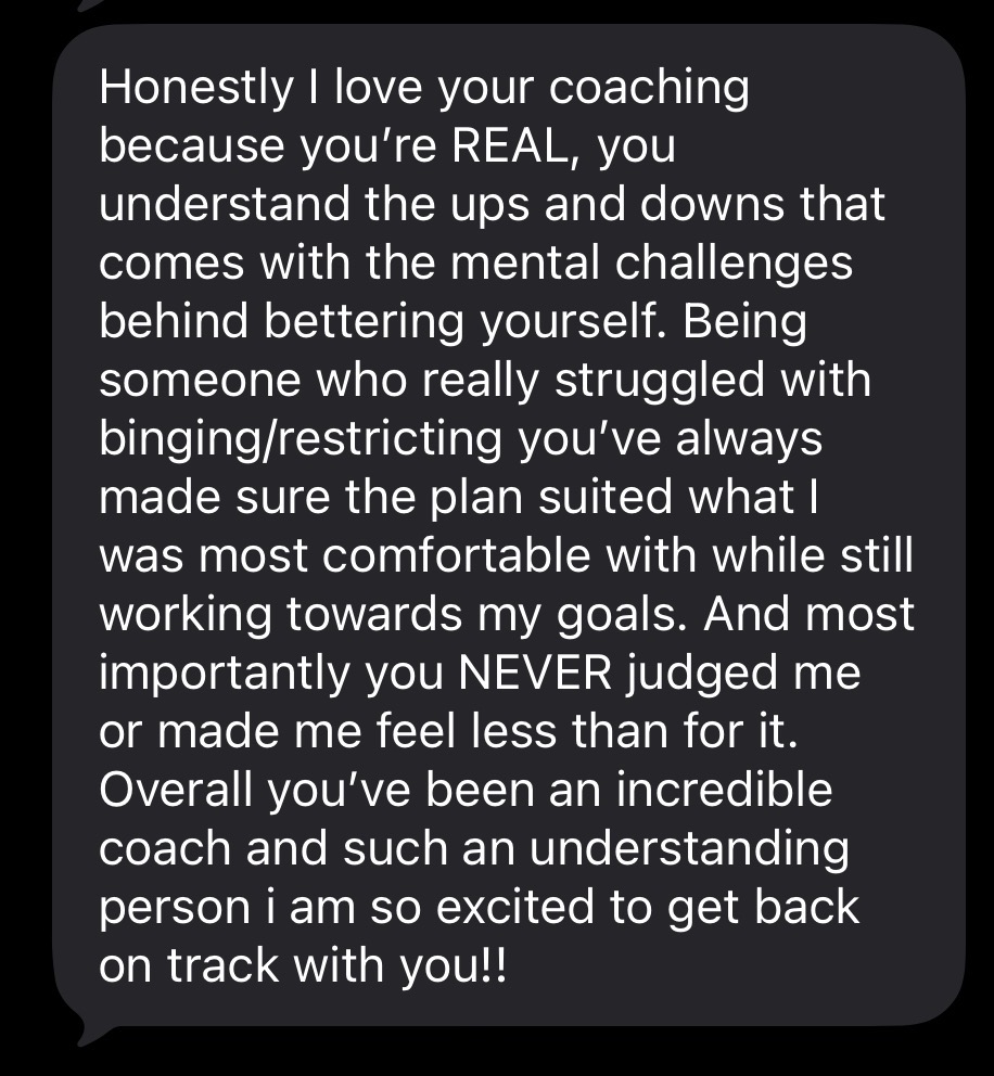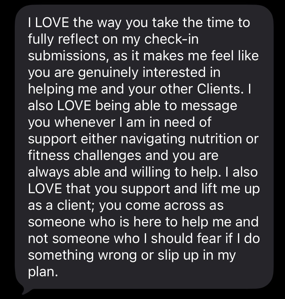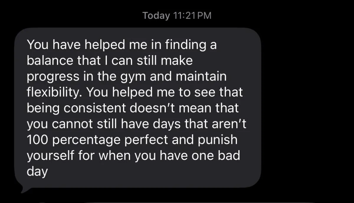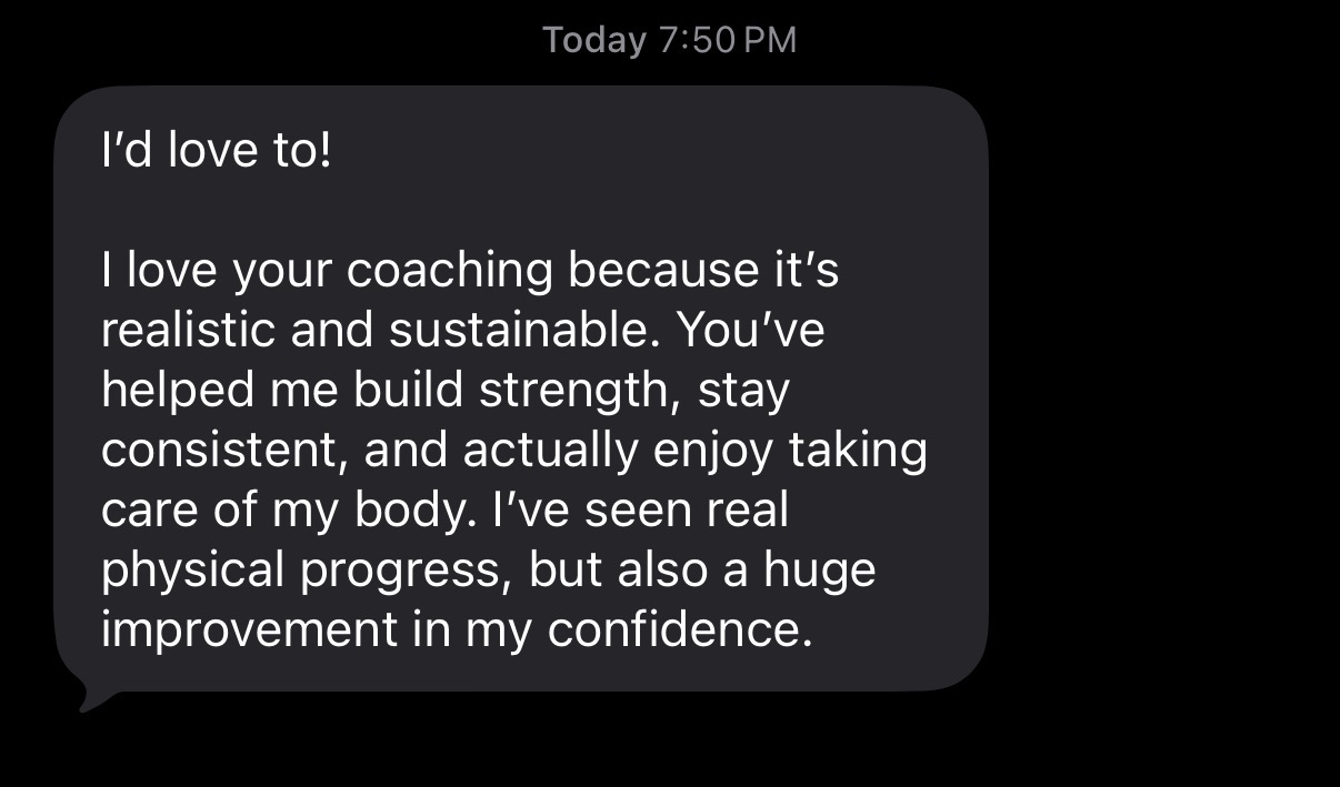 My coaching is about more than just getting you a physical result, it’s about helping you build a healthy relationship with food and with yourself while you work toward your goals. We focus on the mental side just as much as the physical: reducing guilt around food, and creating routines you can actually stick to. Then we pair that with a sustainable plan for training and nutrition that fits your lifestyle, so you’re not constantly starting over, you’re building something you can maintain.